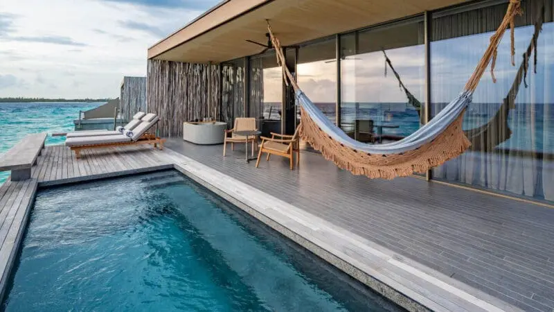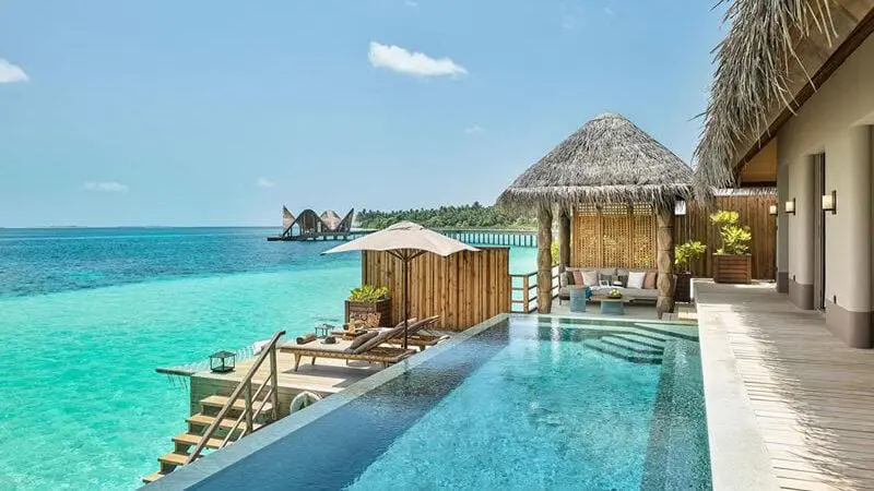 搭乘私人水上飛機短短半小時便抵達僅有「26間」Villa別墅的私人島,首先迎接您的是免費贈送香檳酒與專屬私人管家;每間都配有大型淡水室外泳池,私人甲板上有著愜意的躺椅和鞦韆椅。