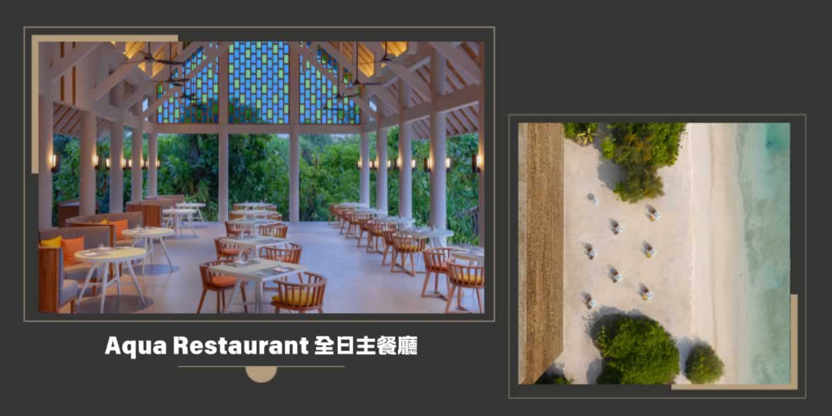 Aqua Restaurant 全日主餐廳 | 各國美食自助餐,主題晚餐包含馬爾地夫特色菜系、義大利菜、南美菜、亞洲融合菜系等。無限量暢飲各類葡萄酒、啤酒、果汁、水、茶、雞尾酒、咖啡、高端酒水單 |