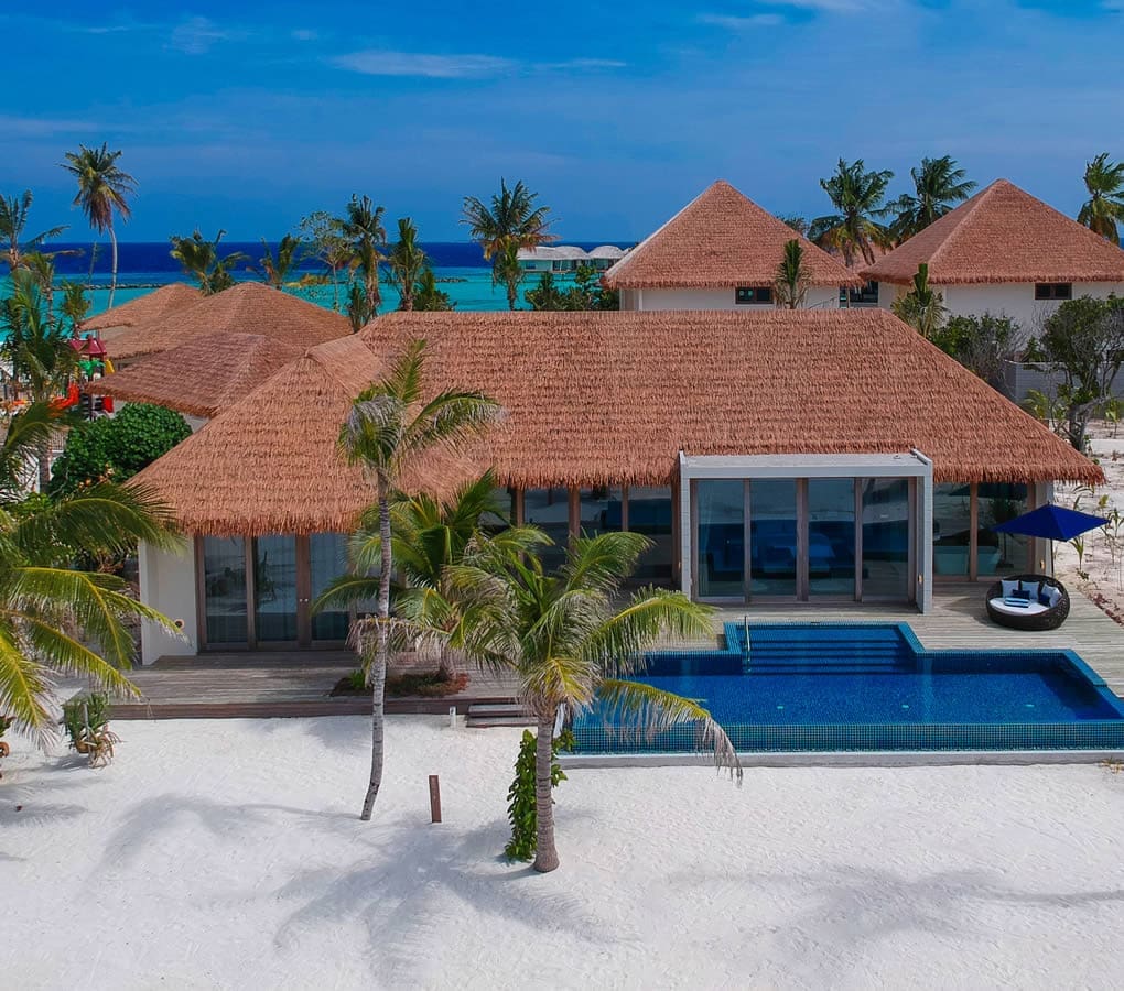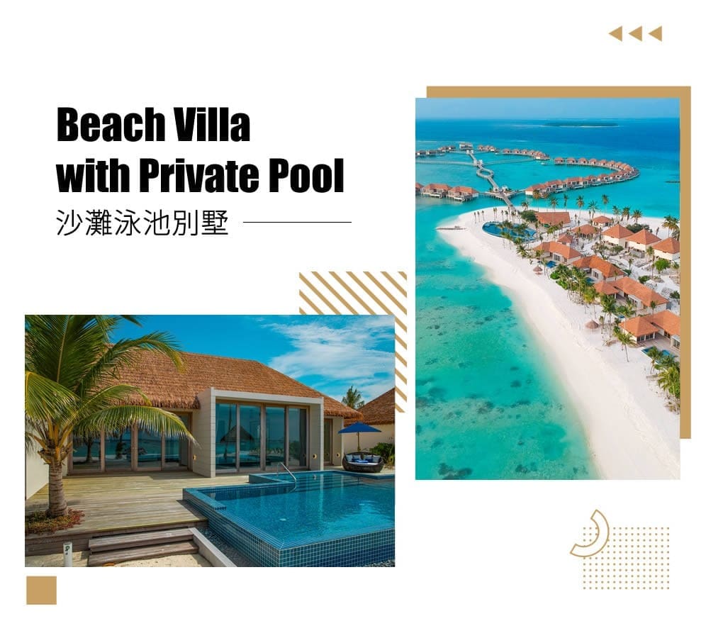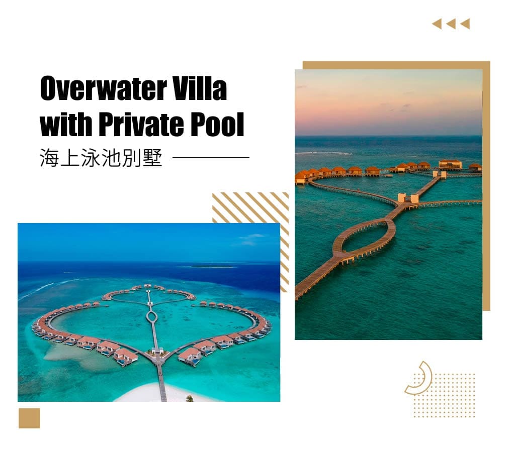 島上共有八種房型,全方位的別墅設計,不論是蜜月還是家族歡樂遊都能盡情滿足。現代化風格和當代的設施搭配著印度洋的原始美景,碰撞出意想不到的視覺享受。水上屋排列成浪漫心型,不要忘記拿起相機,找好角度,留下甜美的一刻。
