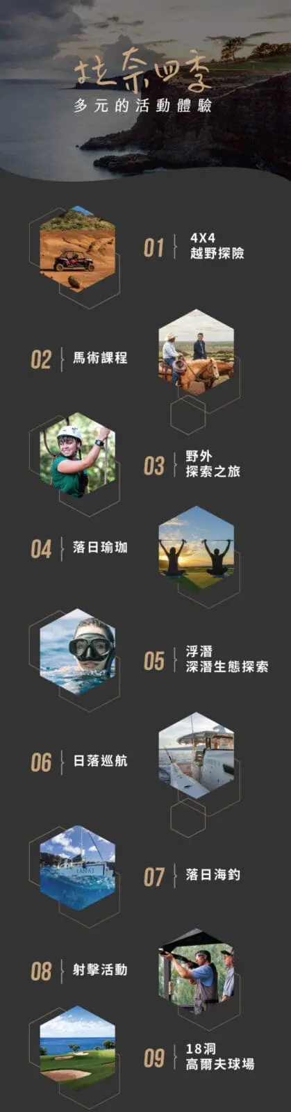 四季拉奈度假村,除了讓旅客享受度假村的悠閒環境之外,更打造了多元的活動項目增加度假的豐富性,無論您想要日出健行、海底探索、趣味溜索、馬術課程、安排各式出海活動,抑或三五球友來場18洞高爾夫球賽,在拉奈四季給您最全面的度假享受。