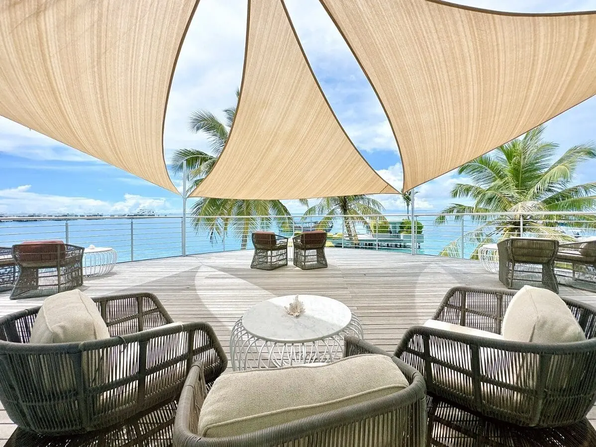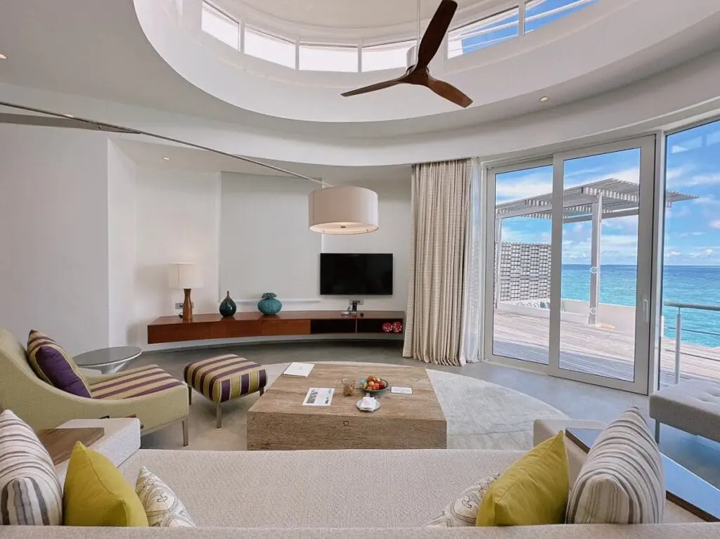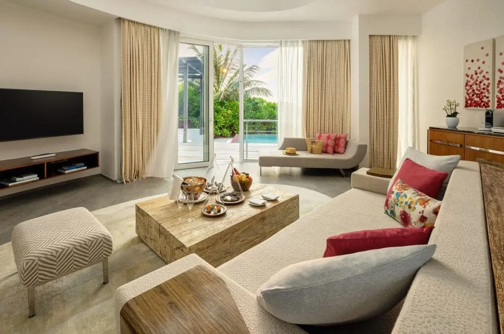 有別於眾人所熟知的茅草屋設計,卓美亞奢華島嶼呈現在賓客眼前的是邁阿密南海風情的繽紛建築色彩。67間獨立的別墅,至少106坪的雙層樓超大別墅空間,每間都配有私人泳池大露臺,基礎房型即有獨立與客房區隔的挑高客廳空間,以及與臥室空間1:1大小的衛浴空間,頂樓露臺讓您盡情領略這個全球海平面最低國度的旖旎風光,夕陽黃昏在私人露臺來場落日星空晚餐,餐後再來場星空電影院,這種不受紛擾假期,讓旅客能得到心靈的全然放鬆。
