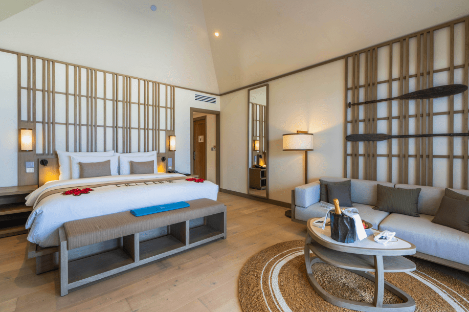 分別坐落在細白沙灘與蔚藍海洋的私人別墅,以原木質調搭配灰白相間的大理石,打造低調奢華的住宿空間,環境寬敞明亮並且配有私人泳池。 特別設計的隱私屏風系統也為貴賓提供了更廣闊的全方位海景,也提高了隱私性。