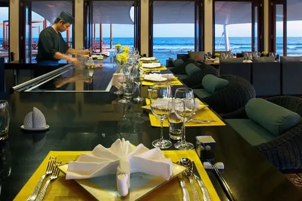 圍坐鐵板桌邊,一邊享受豐盛的新鮮燒烤食材、一邊欣賞技術精湛的主廚為旅客準備豐盛的晚餐。