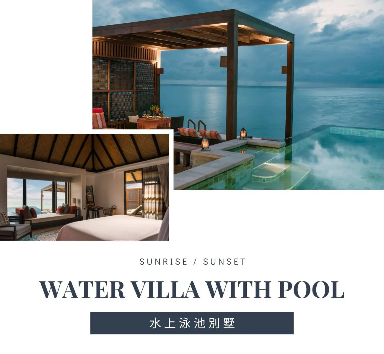 | Sunrise/ Sunset Water Villa with Pool 日出/日落海上泳池別墅 | 32間 | 室內 70 平方公尺/室外 66 平方公尺 |