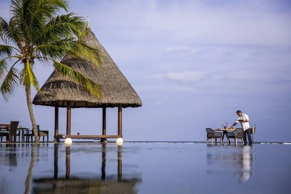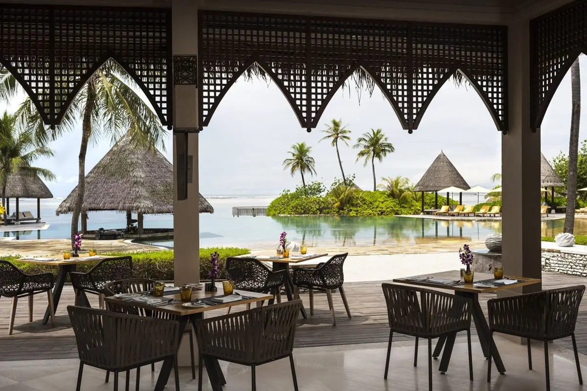 晚上,這裡搖身一變為燒烤餐廳,開放式的廚房提供當天捕獲的海鮮、精選肉品及沙拉,加上位在酒店主要的無邊際泳池旁,在此用餐可盡覽與地平線合而為一的印度洋景觀,可說是另類獨一無二的饗宴。