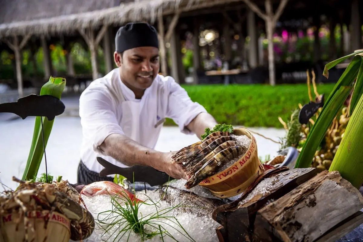 只有在晚餐時間才營業的Baraabaru餐廳,採用印度喀拉拉邦式的柚木建築,主打道地的印度美食及特色有機料理,讓貴賓享用既健康又色香味俱全之美饌。用餐地點可選擇於附設開放式的廚房酒吧,欣賞大廚精心烹飪的過程,或是前往延伸至礁湖的戶外甲板,在水域上的亭閣中來頓私人饗宴。