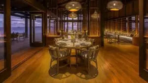 沒有腳本的用餐,您可以選擇任何場地、任何食材與任何時間。任您安排的完美沙灘晚餐,或試一下在海邊矮灌木林中,來個浪漫的叢林燭光晚餐,亦或於個人Villa甲板露台上的星光下,享受親密的用餐時光。無菜單的限制,只要島上擁有的食材,皆可為您做任何一切的烹飪,達到賓客的料理要求;當然包括超過近90種高級葡萄酒和6種奢華香檳選擇,且每支均為Wine Spectator評級為88級以上。