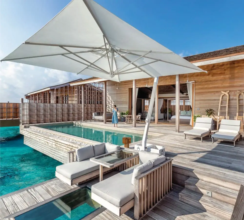 馬爾地夫庫達度私人島由著名建築師Yuji Yamasaki打造僅有15間的日式美學寬敞別墅,擁有44平方米的無邊境泳池露台、最先進的居家電子與環繞音響,利用大型木質可滑動完全敞開推門,營造出令人愉悅的通風感以及不受拘束的自由,並有高級私人管家每天24小時為您服務。