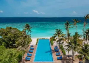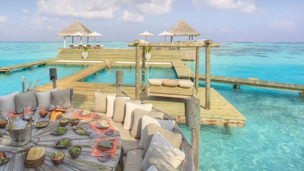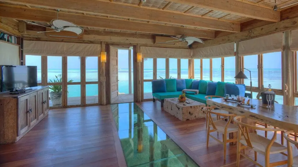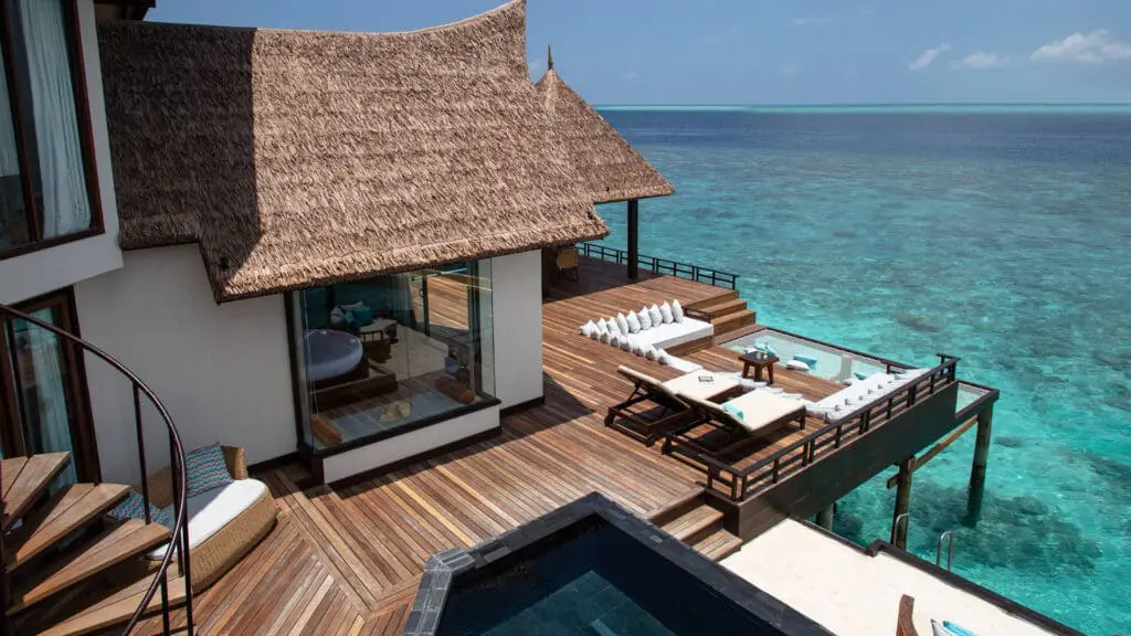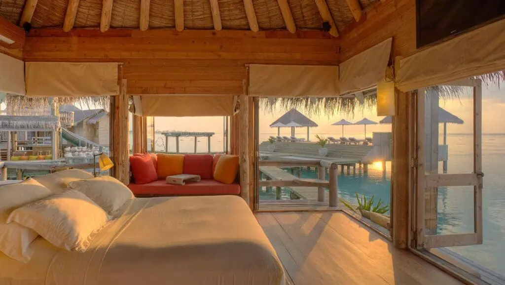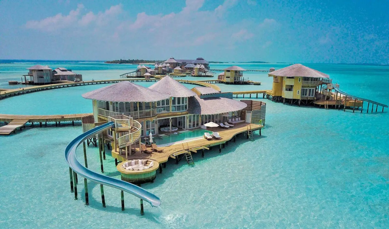 IG熱門馬爾地夫滑水道水上屋的馬爾地夫索尼娃賈尼度假村,從房間直接划進沁涼的印度洋,房間坪數約125坪起,並貼心安排專屬管家,度假放空無需動腦,水上屋頂天窗設計,讓您躺在床上即可欣賞滿天星空,整座度假村僅26間別墅,每棟別墅擁有絕佳隱密性,彷彿置身世外桃源,獨特的露天水上電影院設計,享受在星空下浪漫夜晚