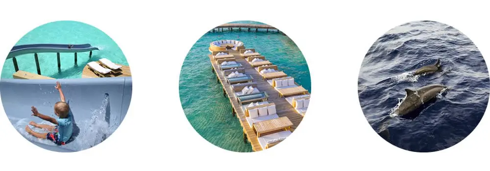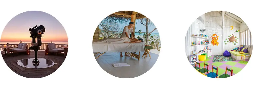 島嶼上設計了琳瑯滿目的多元化設施,除了較常見的水療中心、設備齊全的健身房、瑜珈桑拿、圖書館與兒童樂園區等設置,還有馬爾地夫首座水上觀星台,並結合甲板上餐桌旁的連接望遠鏡之大螢幕,體驗與璀璨群星共進晚餐;也可以在星空下舒適地仰臥在躺椅上,吃著熱呼呼的爆米花或來杯雞尾酒,享受每週兩次播放適合兒童和成人的露天水上電影院。