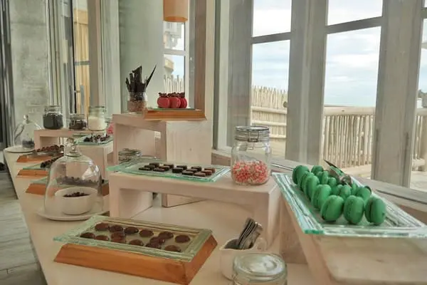 進門便是琳瑯滿目的各式手工巧克力與精緻小點心,不論是蛋白杏仁餅、松露巧克力、特製糖果等,您都能盡情免費品嚐這一切,開心地享受當個開心小螞蟻吧!