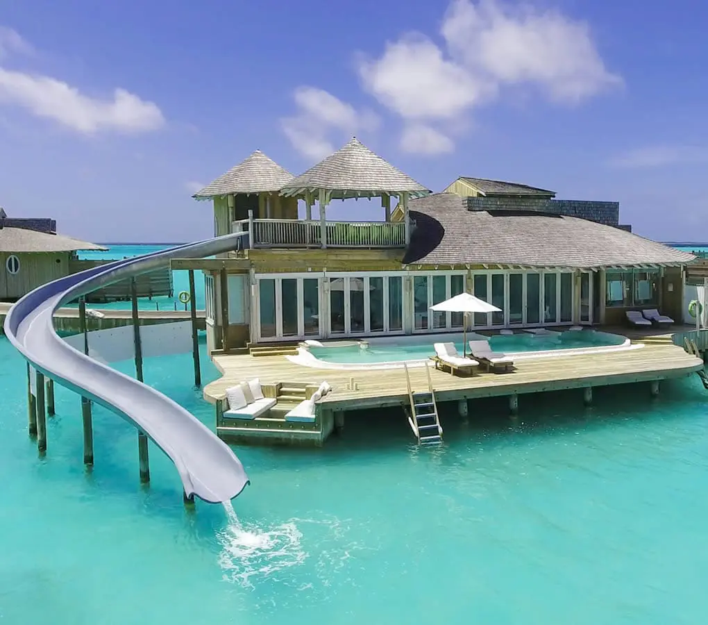 位於風景迷人的Medhufaru 大島上,被諾魯環礁Noonu Atoll 5.6 平方公里清澈剔透的環礁湖包圍,從馬累國際機場搭乘約半小時水上飛機直達,也可以搭快艇前往。從本島延伸出約2公里長的木棧道延伸入潟湖,每間房皆125坪以上,包括熱門水上別墅和綠樹掩映的私密海島別墅,配有私人管家服務,並設有私人游泳池和寬敞的露天浴室!更驚豔的是主臥電動開啟的屋頂,可直接觀賞滿天星斗,以及水上屋2樓的滑梯,帶著你從房間直接划進沁涼印度洋。