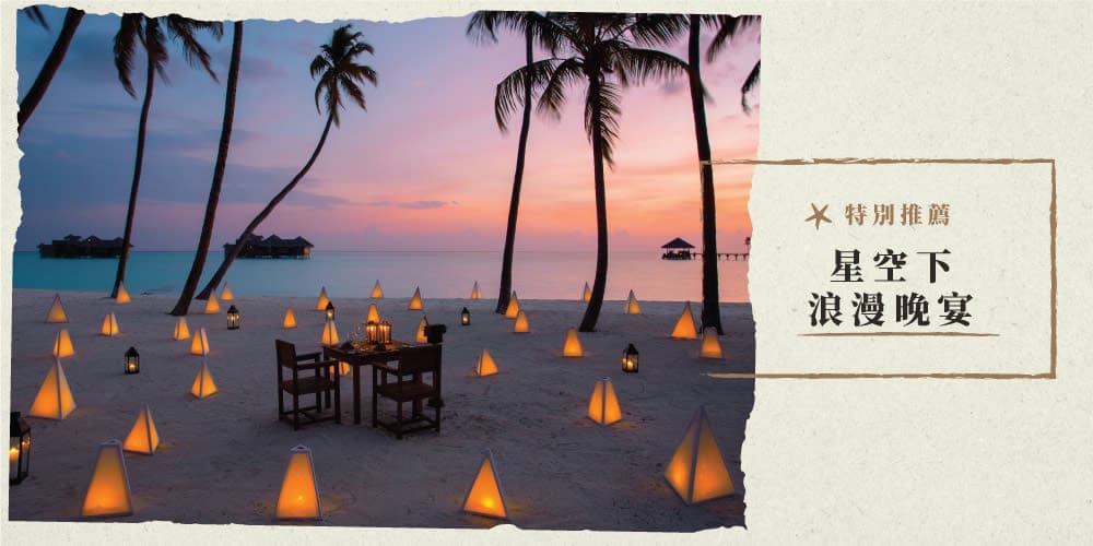 您可以打破常規,將餐桌移至於星空下,可從島上任選其一處,享受專屬於您的浪漫用餐體驗。