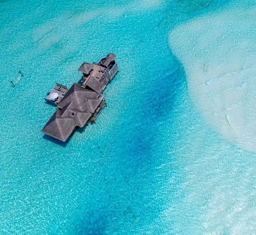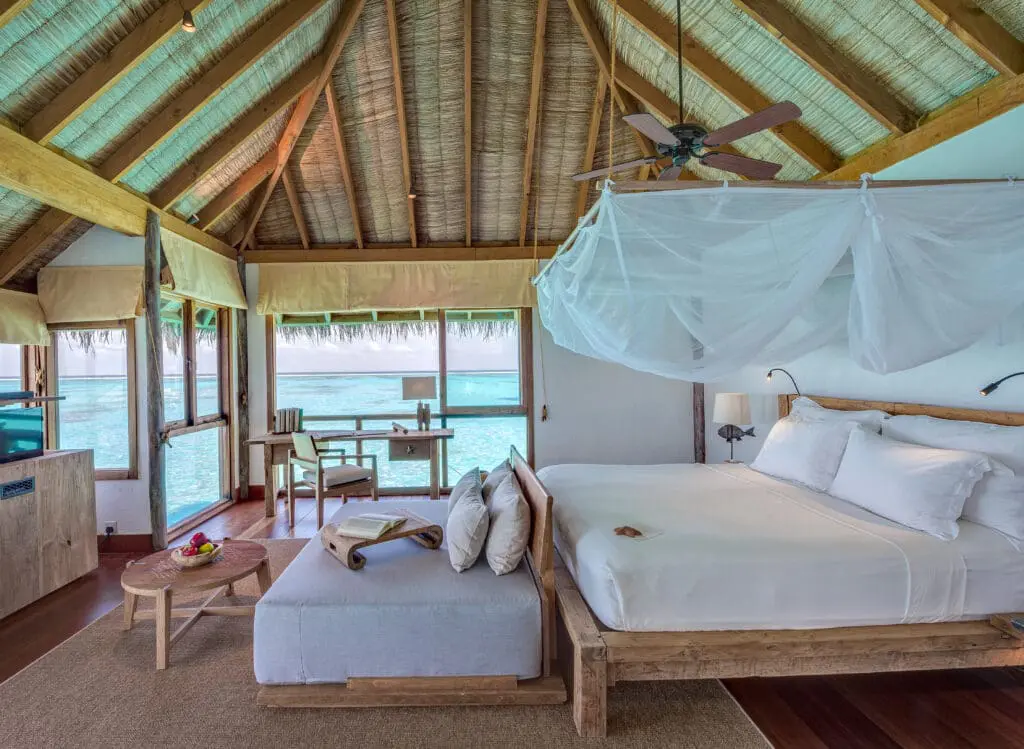 馬爾地夫首創整座島只有水上屋房型,引領風潮,且僅有45間房數,Villa坪數都65坪以上,廣闊的大型海上平台可舒適望海觀星。別樹一幟的「Crusoe Residence海上屋」跟其他海上屋不相連、獨立在海中央的建築風潮,大大提高隱私,飯店也會提供通行小船供貴賓使用;另外,創新的海上滑水道房型、海上豪華行宮風格、貼心管家服務,一切皆深受名流喜愛。最特別的是還能與滿天星斗共眠,露天的別墅讓您感受海風星辰相伴的浪漫氣氛,100%值回票價的一生回憶在此創造!