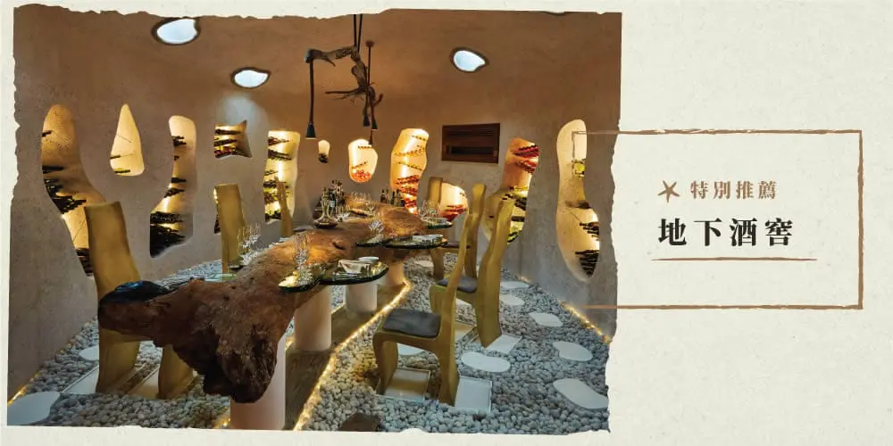 我們獨具特色的地下酒窖儲存著來自世界各地的葡萄酒,沿著玻璃台階而下,進入宛如洞穴般的地下酒窖,率先映入眼簾的便是中心擺放著的一塊巨大浮木(被海浪席捲到岸上)。這裡窖藏著來自眾多國際產區的 400 多種葡萄酒。您可來到這個舒適的空間,聆聽卓有見識的侍酒師團隊講解有關葡萄酒的更多知識。