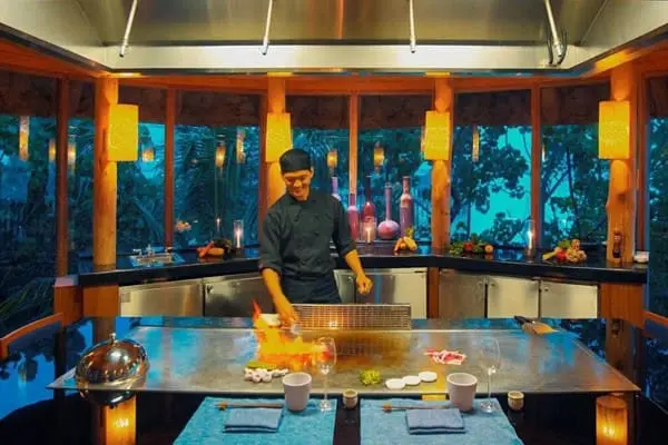 By The Sea 依水而建,融合秘魯與日本的烹飪文化,搭配令人歎為觀止的海洋景色。餐廳可供26位客人用餐,僅有五張餐桌和沙發床座椅區,精緻靜謐。位於島上雙層樓宇的2F,精緻非凡的鐵板燒及日式料理,在這裡您可以享用精緻握壽司、新鮮刺身、甘醇清酒;您可欣賞到鐵板燒廚師的高超廚藝,樂享其現場特別為您烹製的可口晚餐。