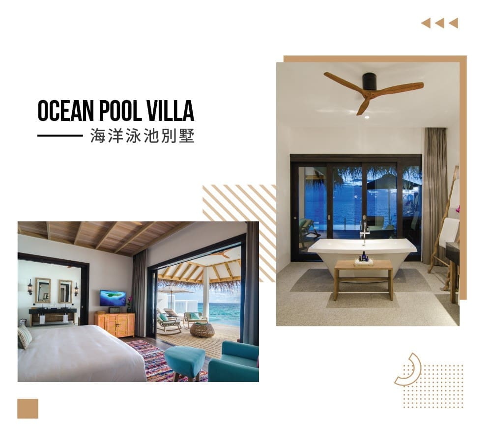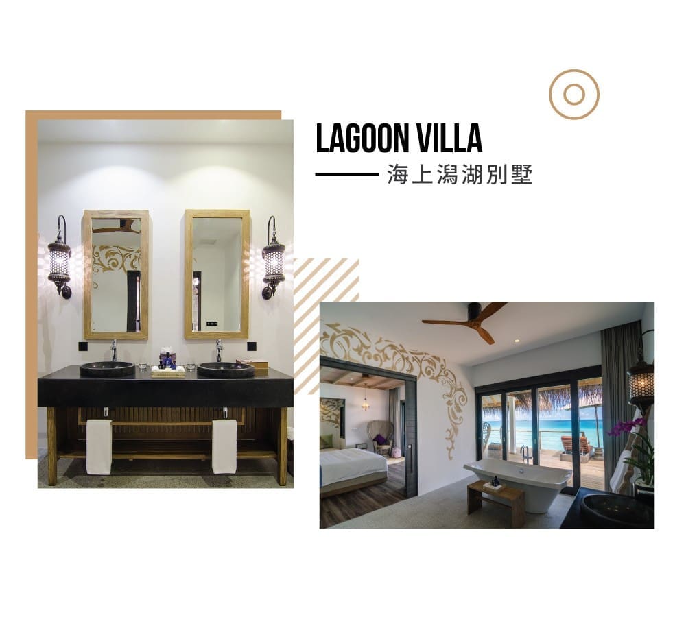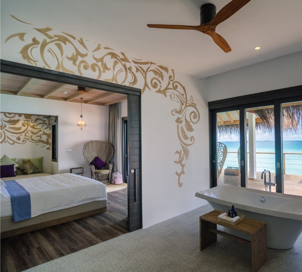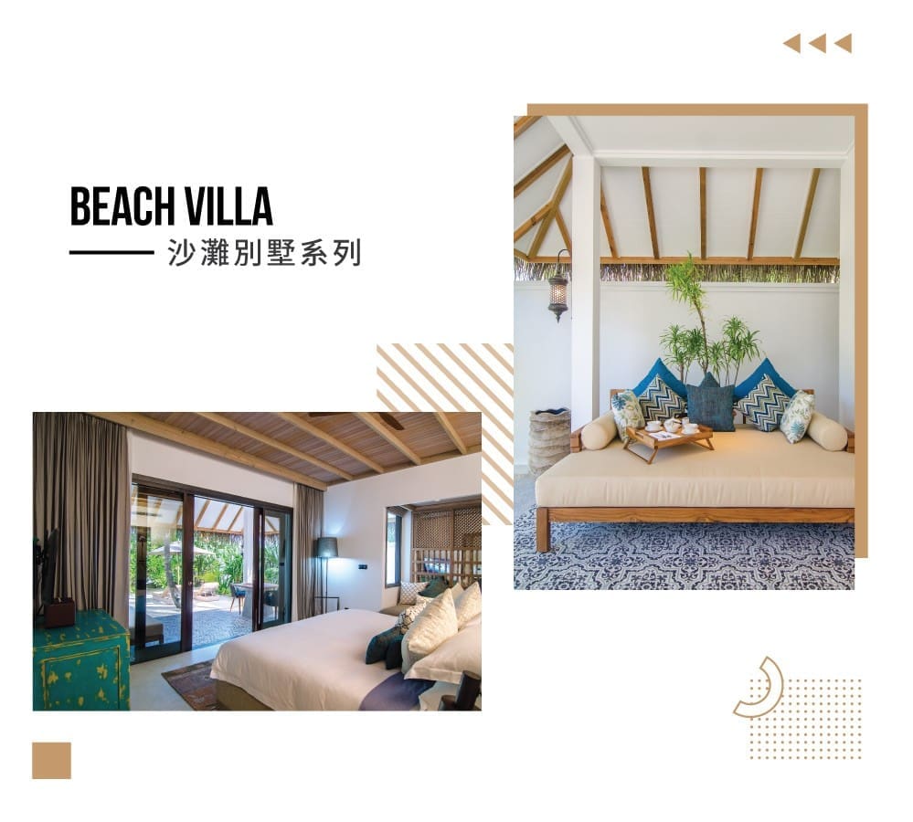 海上、瀉湖、沙灘上共有125間別墅,風格設計以復古風格搭配波希米亞,精緻兼具復古的風格,讓整體充滿輕鬆地渡假氛圍,除此之外,還可體驗最新推出的「沙灘泡泡屋Beach Bubble House」,是馬爾地夫首創的全新體驗,舒適的內裝、訂製木質地板和傢俱、獨立隱密的衛浴,還有「全透明」的泡泡帳篷讓你更貼近四周的大自然美景,抬頭可見滿天星斗,遠離塵囂,好好享受整個印度洋的寧靜。