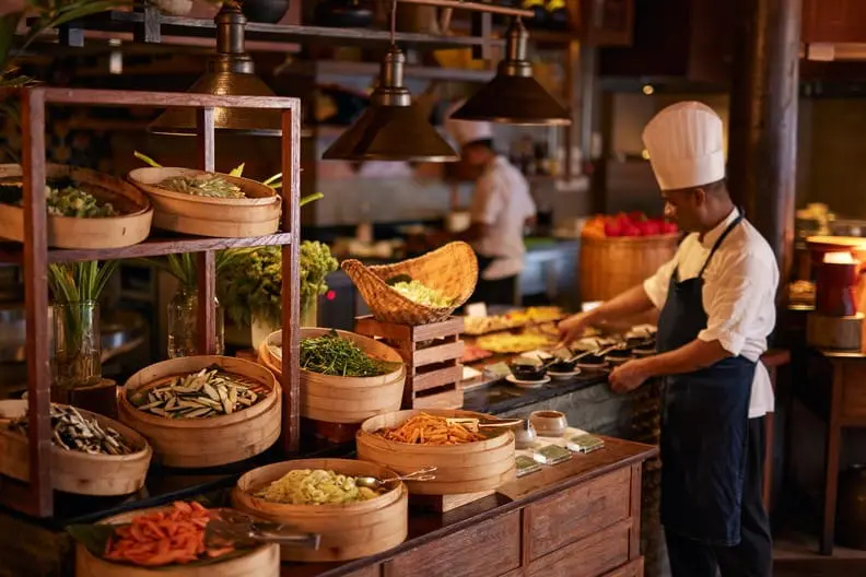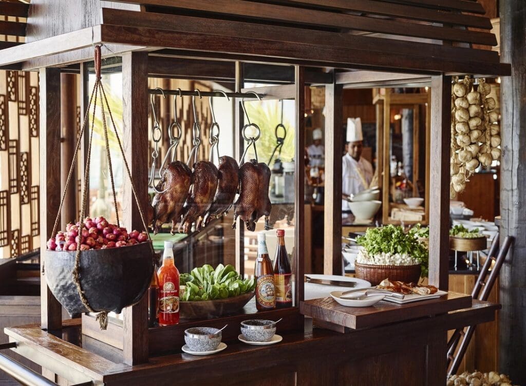 亞洲餐廳座落於水面之上,裡面的互動攤位可讓您在欣賞廚藝同時,品嘗純正的泰國、中國、越南和菲律賓風味佳餚。在此更供應著北京烤鴨、蒸籠點心,讓在海外度假的旅客不時可以懷念家鄉的亞洲菜系,在馬爾地夫能來碗熱騰騰的湯更是感到無比的幸福。若想要一享經典的歐式生活,那就追隨玻璃烤箱內散發出的羊角麵包、法式長棍、糕點、烤餅的香味來感受一下吧,手藝精湛的廚師就在眼前,讓您的渴望呼之欲出。