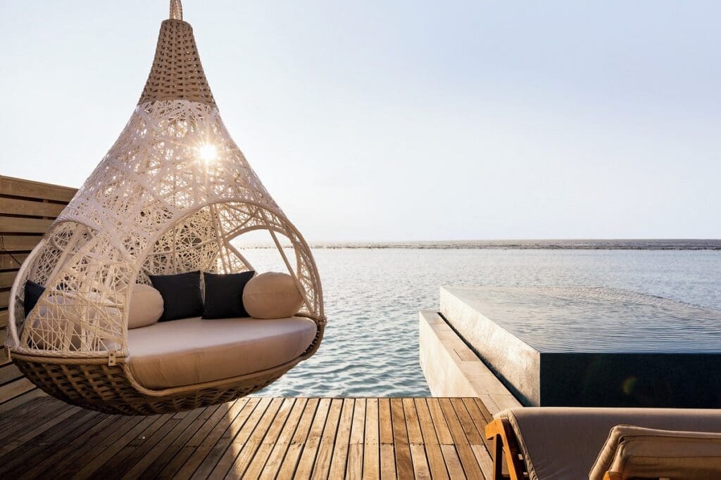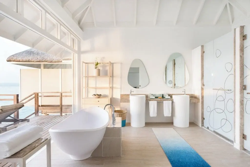 Water Villa 水上別墅 | 坪數約有98 平方米。不僅房間面海,連在衛浴區也能直接欣賞印度洋,在這泡澡絕對是一大享受! 戶外露臺也有網床&躺椅,非常適合拍美照~