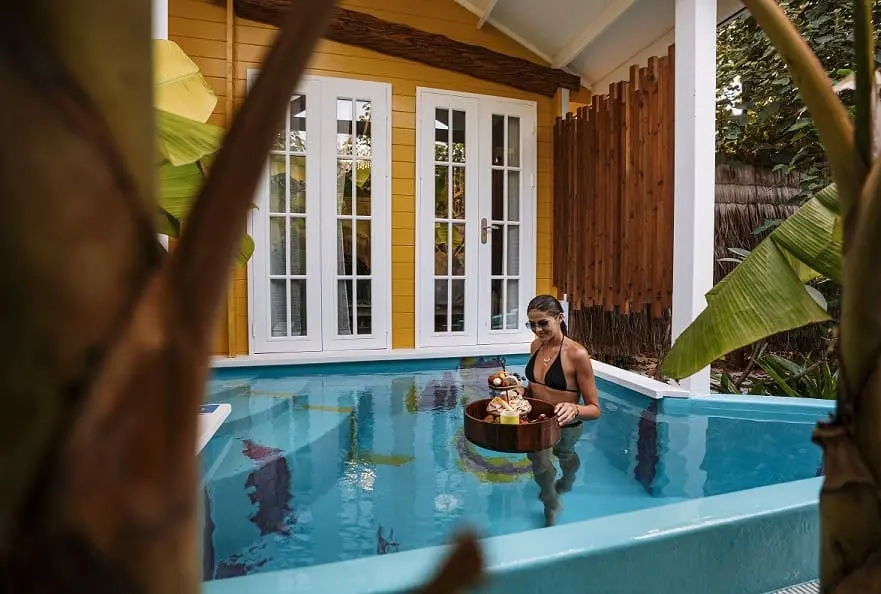 與別墅相連的沙灘酒吧,提供世界各地的手工啤酒與琴酒。獨特的泳池設計,讓賓客從別墅即可暢游至酒吧,享受沁涼啤酒。