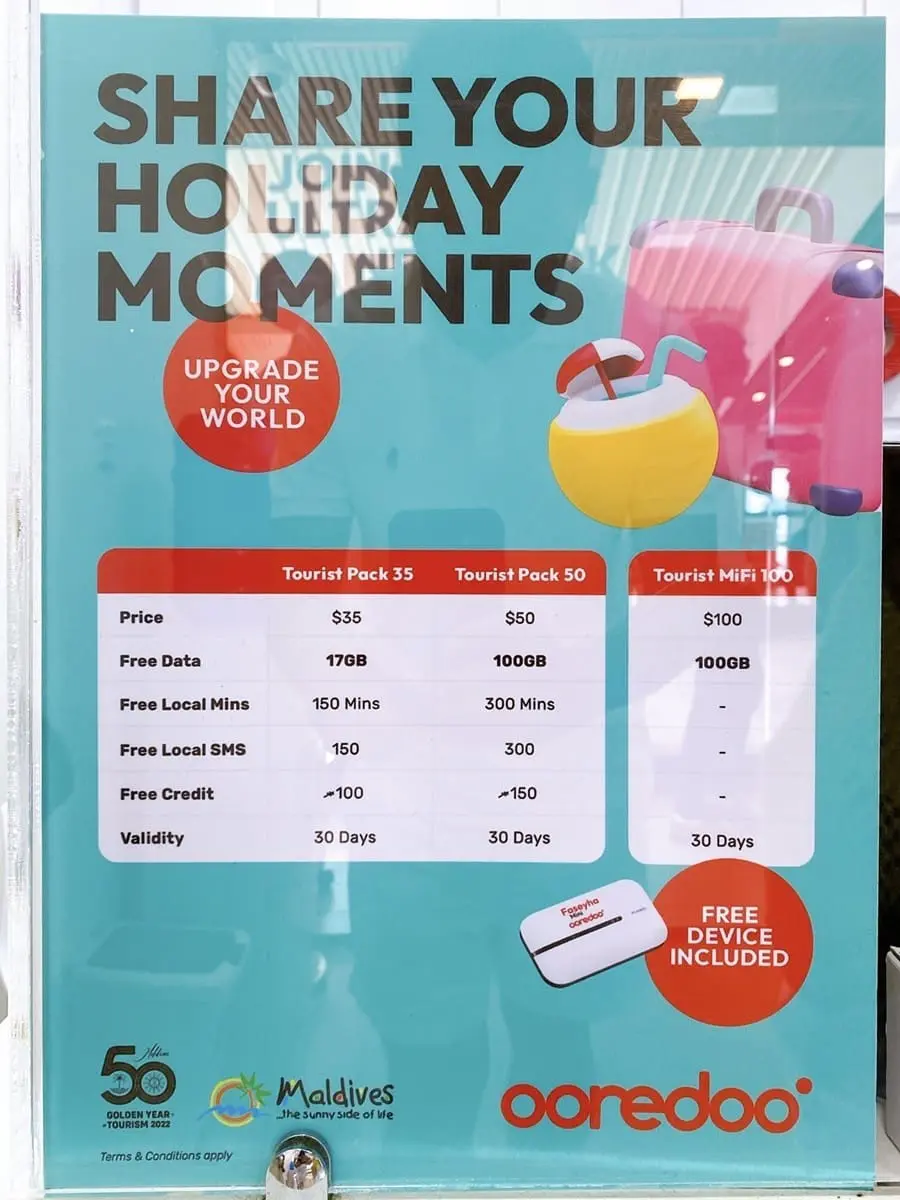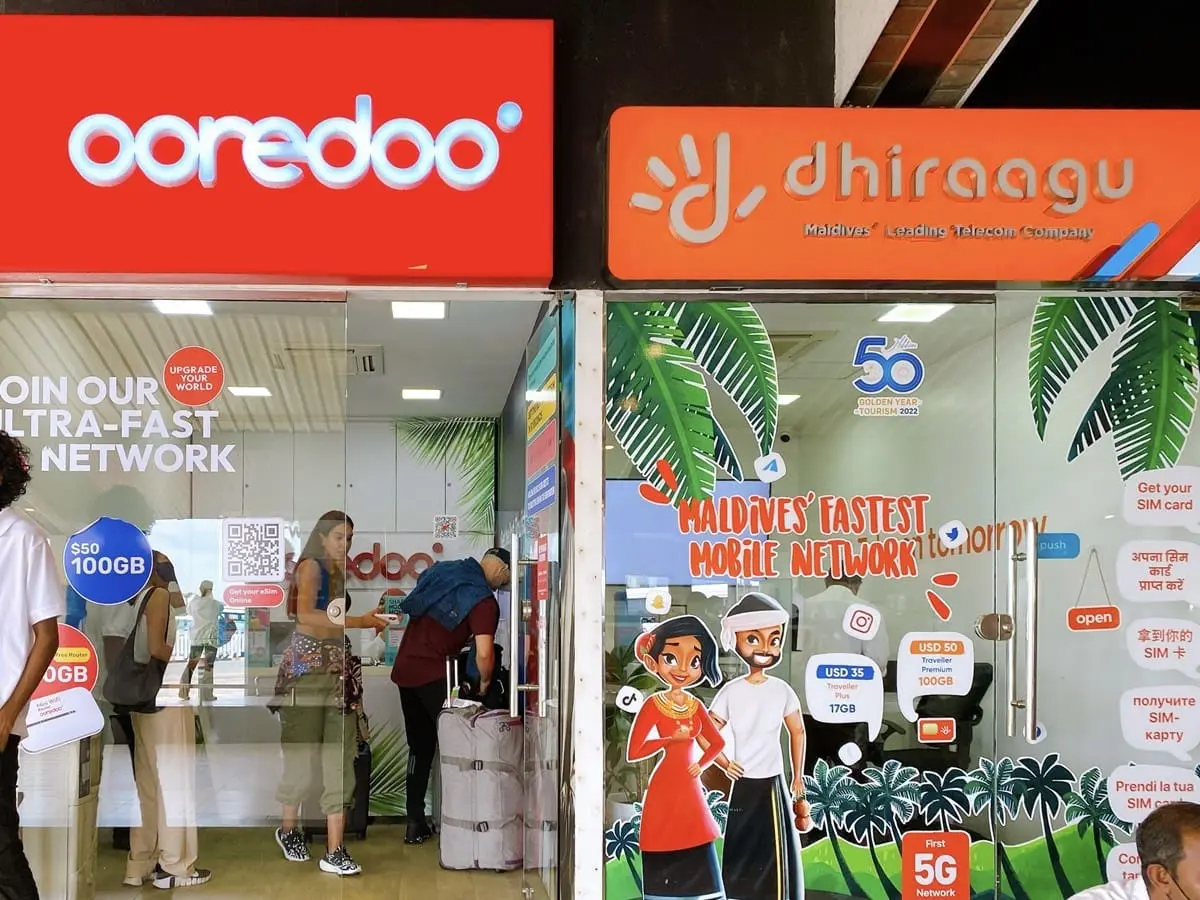 抵達馬爾地夫後,可選擇購買當地的網絡卡以保證旅程中網絡暢通。兩大電信公司 Ooredoo 和 Dhiraagu 在機場出口提供服務。