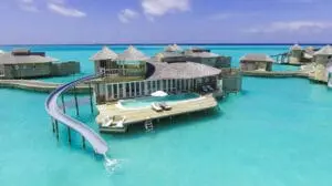 位於風景迷人的Medhufaru 大島上,被諾魯環礁Noonu Atoll 5.6 平方公里清澈剔透的環礁湖包圍,從馬累國際機場搭乘約半小時水上飛機直達,也可以搭快艇前往。從本島延伸出約2公里長的木棧道延伸入潟湖,每間房皆125坪以上,包括熱門水上別墅和綠樹掩映的私密海島別墅,配有私人管家服務,並設有私人游泳池和寬敞的露天浴室!更驚豔的是主臥電動開啟的屋頂,可直接觀賞滿天星斗,以及水上屋2樓的滑梯,帶著你從房間直接划進沁涼印度洋。