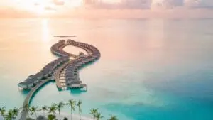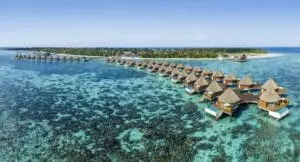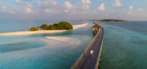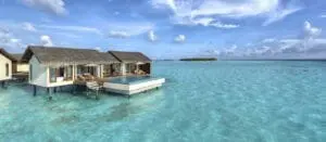 馬爾地夫萊佛士度假酒店Raffles Maldives Meradhoo Resort 分別有水、陸兩個島嶼,為旅客提供雙重非凡的自然美景。從馬列機場搭乘國內線班機50分鐘,欣賞著碧海藍天與馬爾地夫的珊瑚島鏈,15分鐘的快艇接駁即可抵達這座幽靜的度假島嶼。