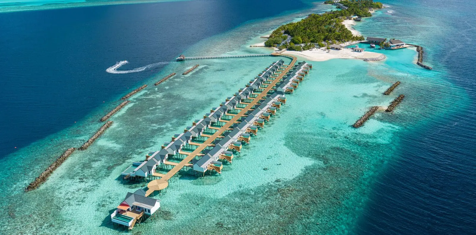 度假村座落於馬列北環礁,搭乘快艇約50分鐘即可抵達。周邊擁有豐富而原始的海洋生態,孕育出繽紛珊瑚與多樣海洋生物,堪稱浮潛天堂。專屬浮潛碼頭距離海岸僅數步之遙,讓賓客輕鬆展開一場精彩的水下探險