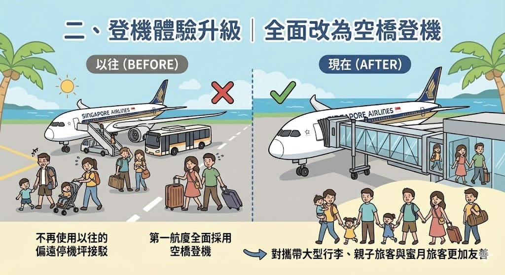 第一航廈全面使用 空橋登機,不再像過去一樣需要搭接駁車前往偏遠停機坪,對蜜月、親子與攜帶大型行李的旅客更加便利。