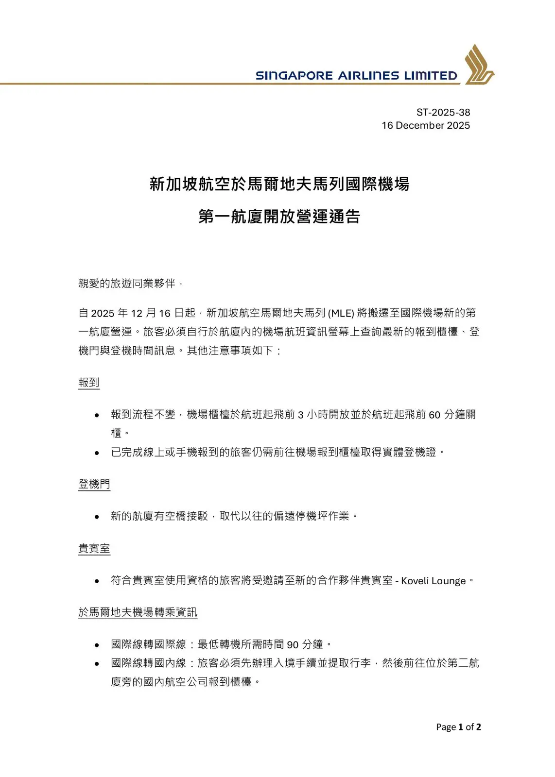 自 2025 年 12 月 16 日起,新加坡航空(Singapore Airlines, SQ)所有往返馬爾地夫馬列國際機場(MLE)的航班,將全面改由「第一航廈(Terminal 1)」營運。